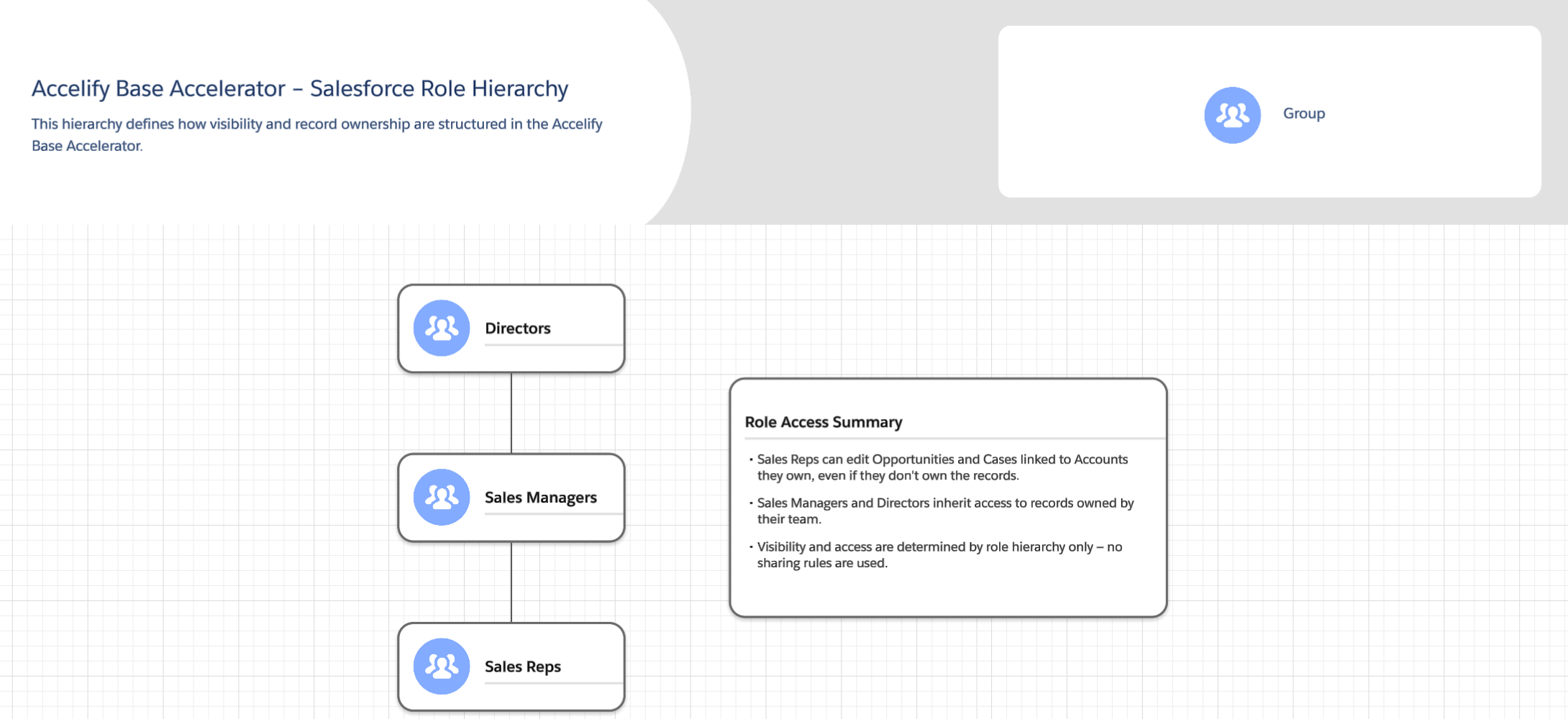 The Accelify Sales Hub provides your organisation with a secure, scalable Salesforce environment built on industry best practices. Your security model is: